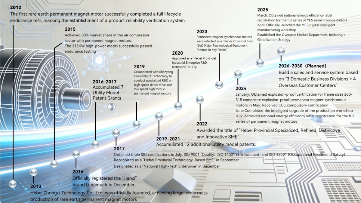 The “HANCI” trademark was registered in 2016. Our company has been recognized as National High-Tech Enterprise, Technology-based SME of Hebei Province, and Provincial “Specialized, Refined, Differential and Innovative” Enterprise. We obtain certifications of ISO 9001 in Quality Management System, ISO 14001 in Environmental Management System, and ISO 45001 in Occupational Health and Safety Management System and hold 19 utility model patents for permanent magnet motor technology, with several additional patents pending.